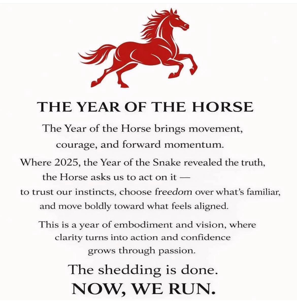 My sister Traci alerted me to the fact that 2026 is the Year of the Horse. It seems so appropriate in lots of ways, not the least of which is that she herself is a horsewoman extraordinaire. She has a rescued Mustang and three miniature horses, which she shares with the community at various events, often involving animal rescue or charities benefitting children with terminal illness. She does what more of us need to do, namely shift our attentions to making the lives of others just a lil’ bit happier. You can find her and her boys on her Instagram @thesmallsminihorses. Do check her out and be inspired.