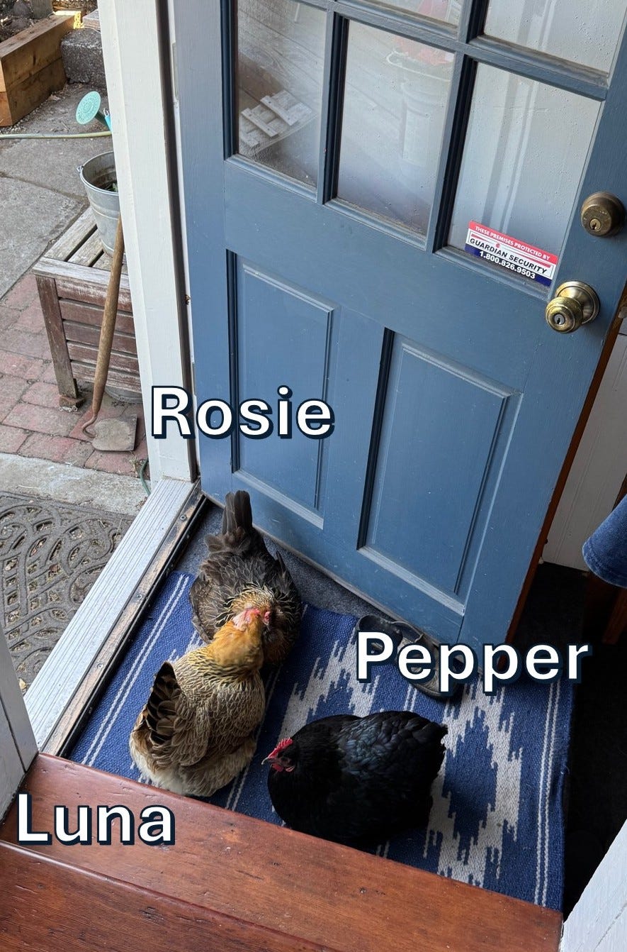 Last week, I was house sitting for friends who went to Europe. I was also chicken sitting for Luna, Pepper, and Rosie, my friends’ beloved fine-feathered “babies”. Despite what you see in the photo, these girls don’t live in the house. They have their own “house” (coop), and so I went to put them in theirs for the night around 3:00pm one afternoon. And that’s when the fun began.